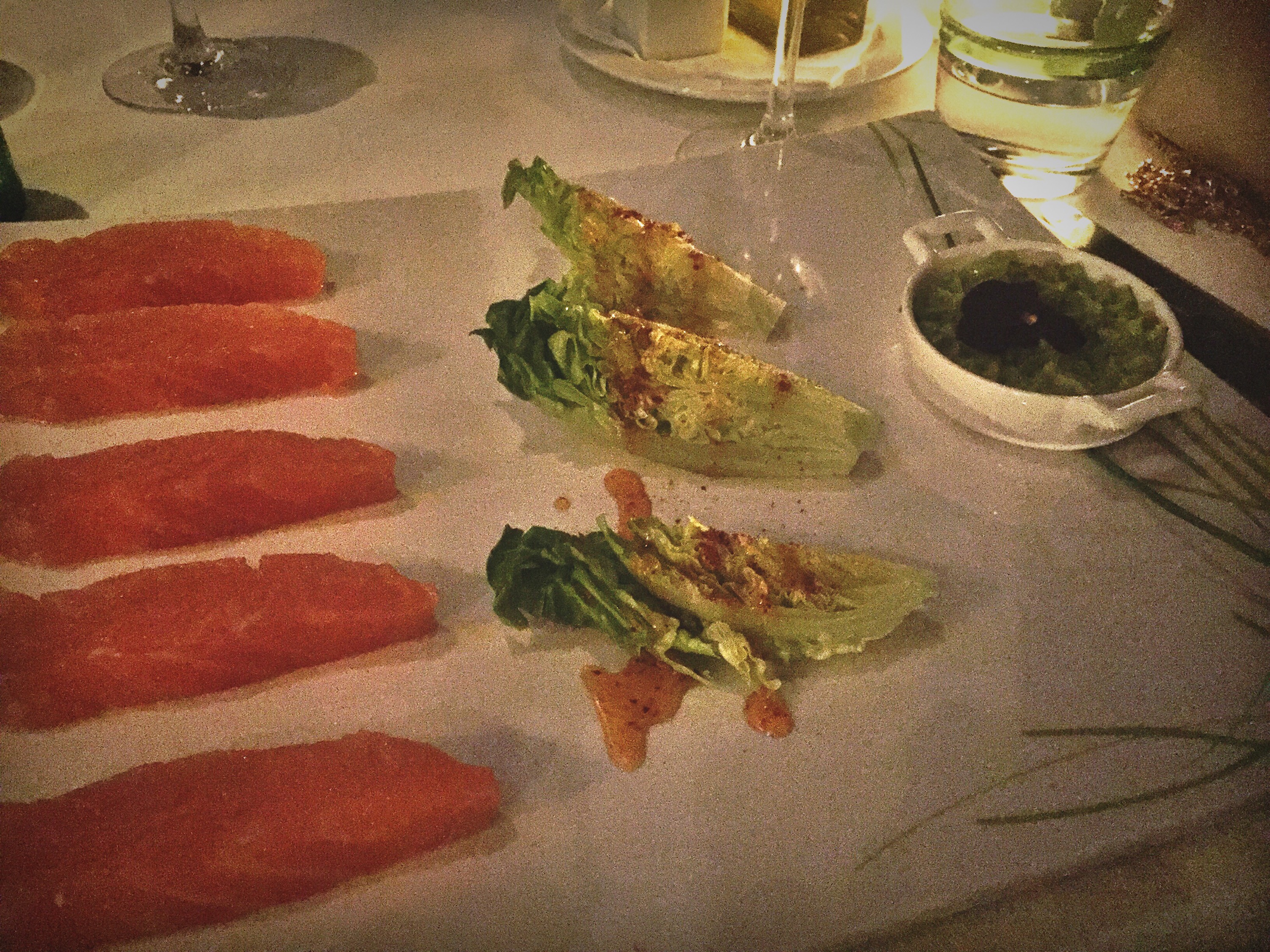 We were served water and started with a glass of champagne. We received a small platter of appetizer, followed by a fish terrine as amuse-bouche.