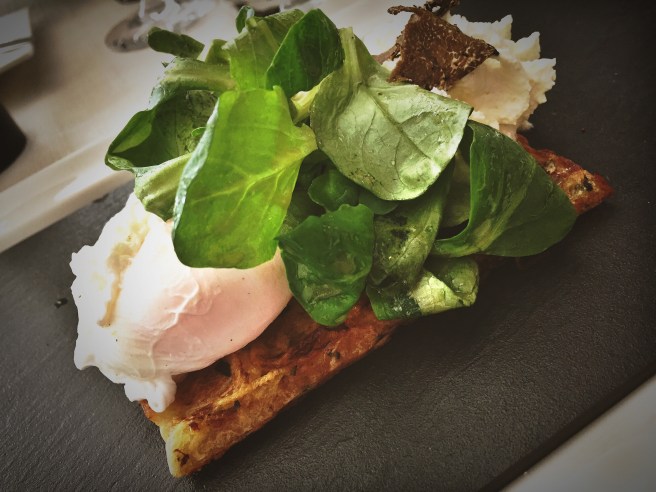 We had a side table facing the street and, after a cremant aperitif accompanied by some focaccia canapé, we received a Saint Jacques amouse-bouche. I went for a poached egg with  potatoes pancake and truffle while hubby had foie gras and then we continued with rack of doe for two. We had half bottle of red wine and two coffees for a total bill of 127 euro (2 cremant, half bottle of wine, two starters, two mains, two espresso, half water)..