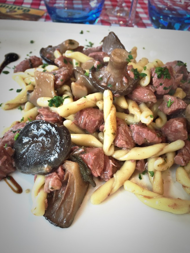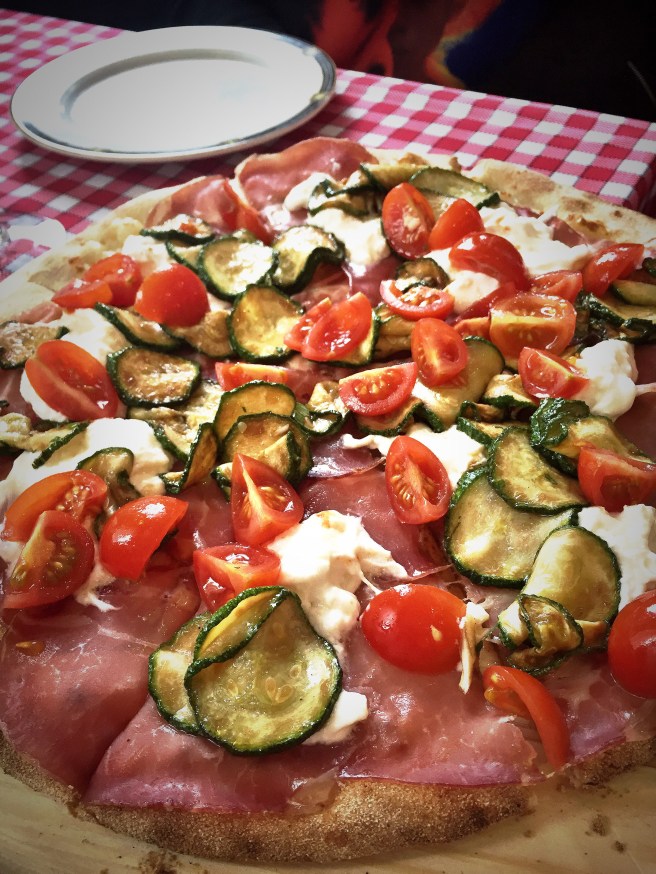 While having an aperitif – Italian alert: they have the real Camparisoda – we were served some small bruschetta with cheese. We then had a pizza to share as starter – with cherry tomato, cheese, zucchini and ham – and I ordered some pasta with mushroom and lamb meat.