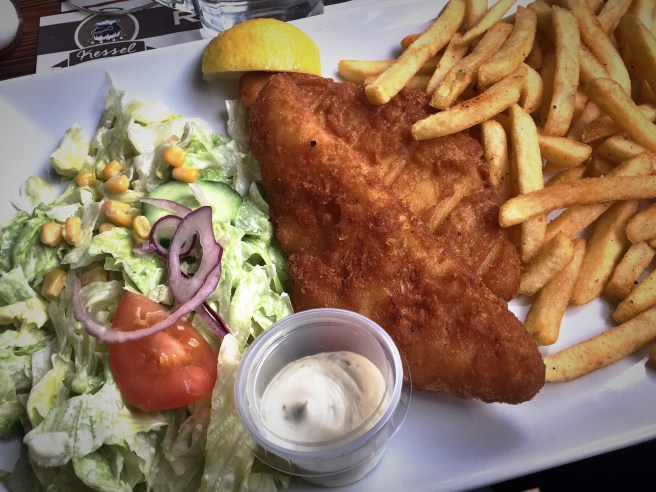 - For the fairs standards and in consideration of the price (22 Euro for fish&chips plat), I find the portions a bit too small, the one for hubby in particular. Hamburgers we have seen at other tables looked definitely better than our dishes, so probably just wrong choice on our side 🙂