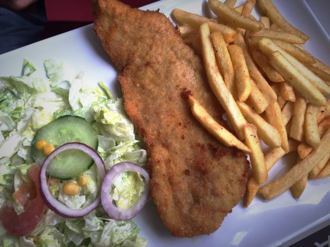 We had few minutes to check the menu – jarret du porc, fried fish, Luxembourgish platters, hamburgers among the choices – and another nice waitress came to take our order. She asked the drinks first – we had water and some wine for hubby – and as for dish, I chose Fish & Chips and hubby a Kessel Schnitzel.