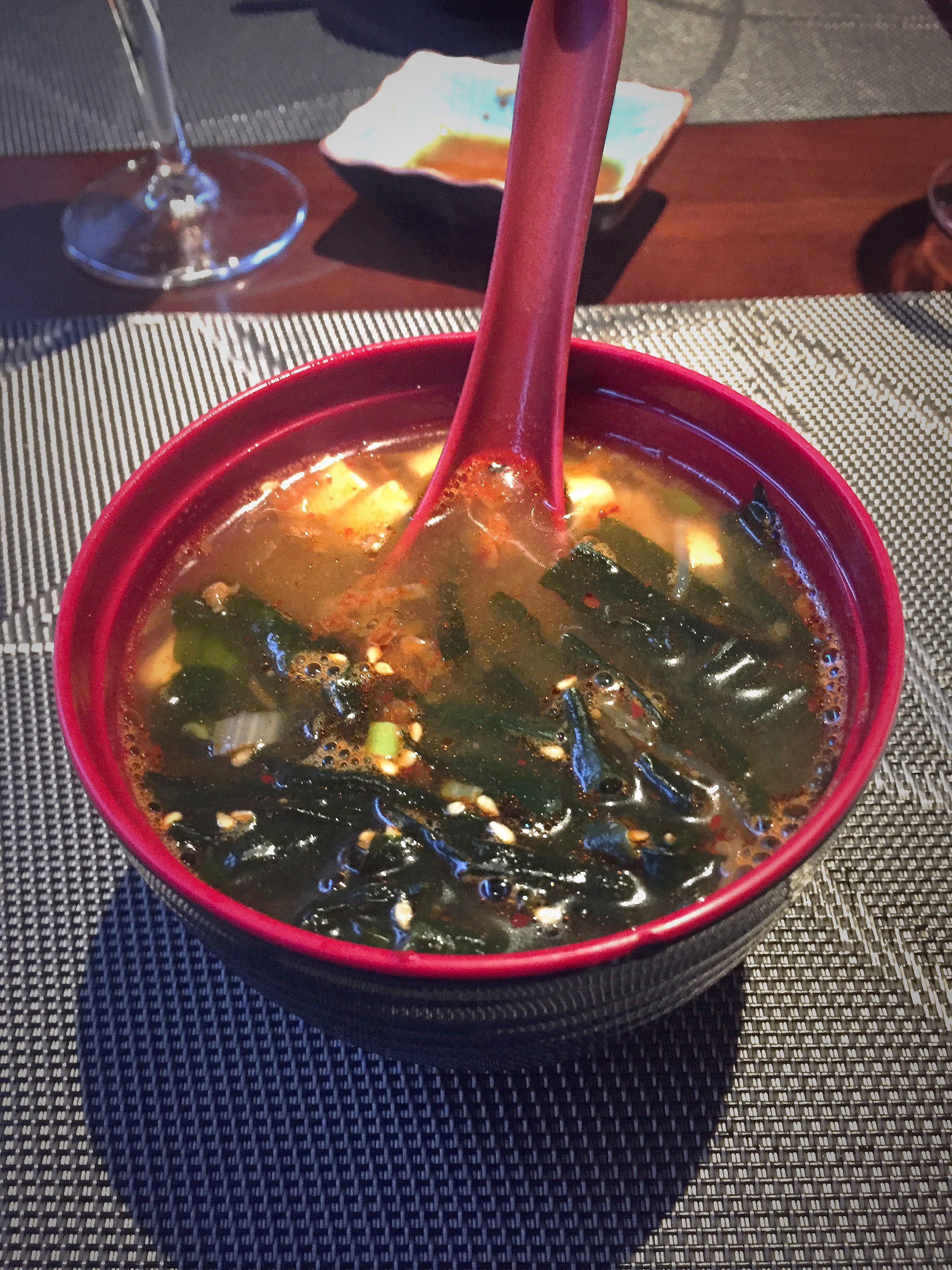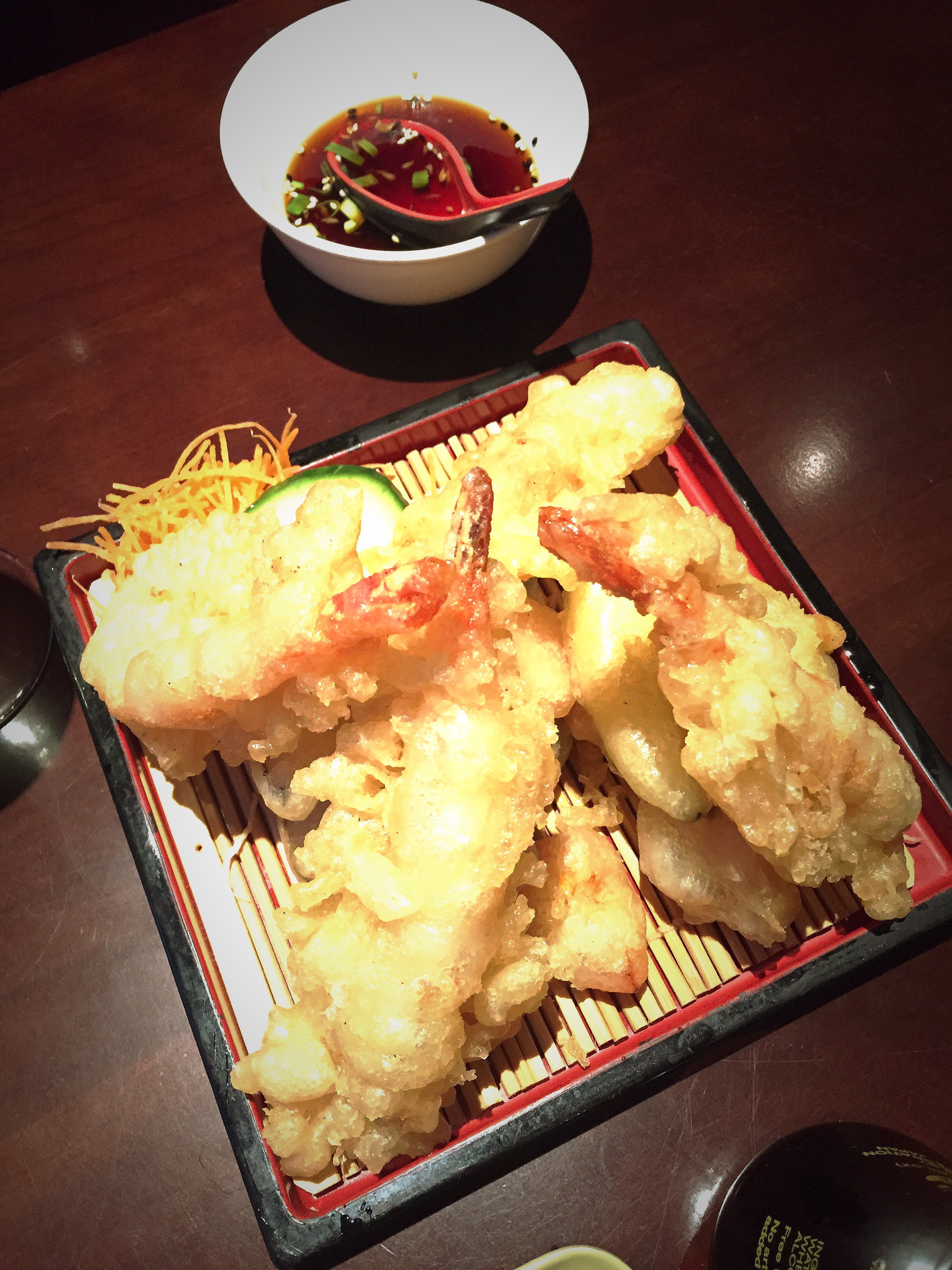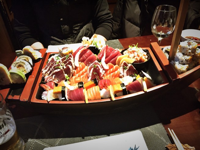 After requesting some clarifications from the menu, we decided to go for the Warrior plat – a ship with several kind of sushi and sashimi – and a portion of tempura. The waitress pointed out it was pretty much but we were really hungry. The ship was anticipated by a miso soup included in the deal – I had a spicy one that was extremely good.