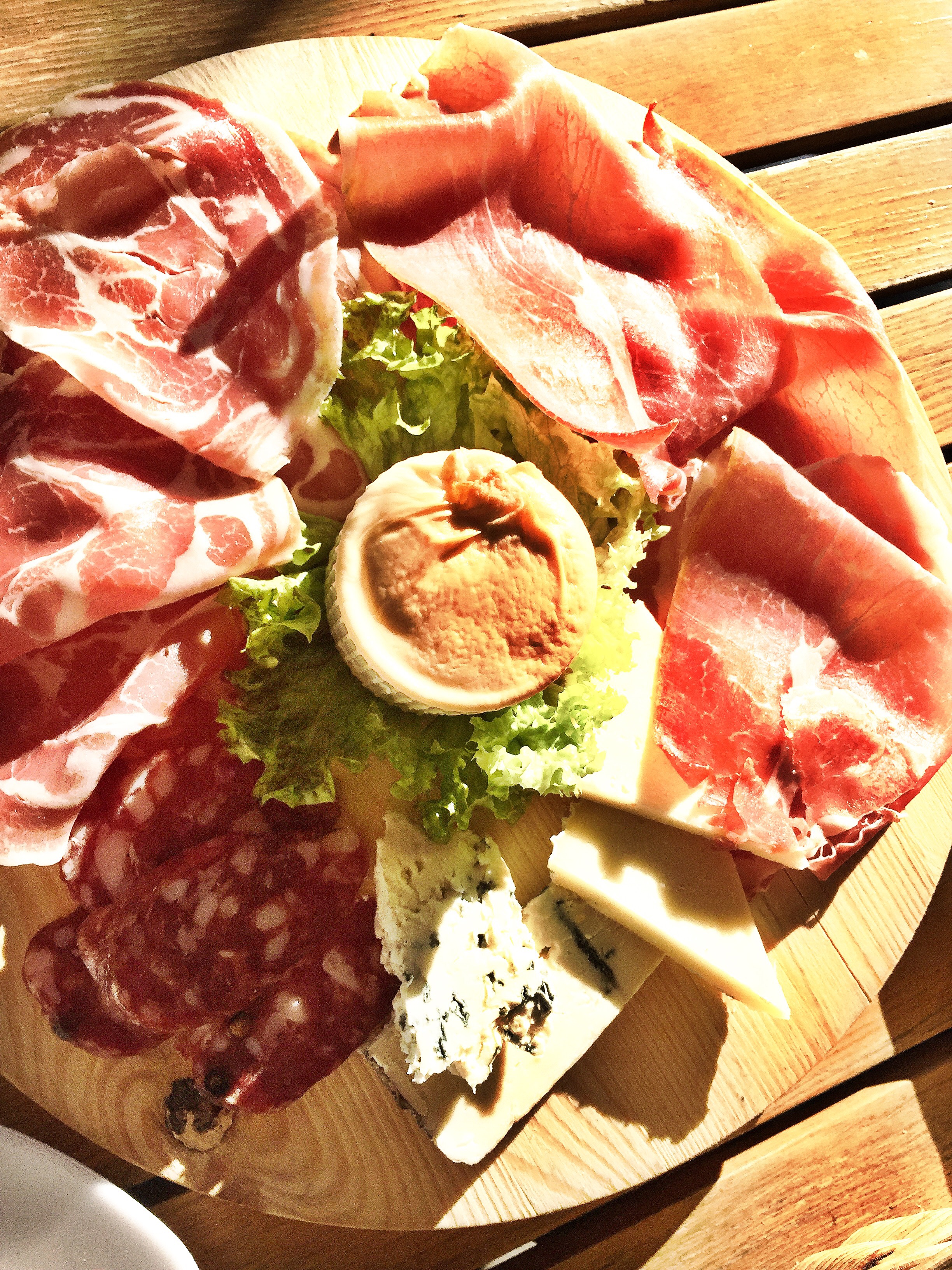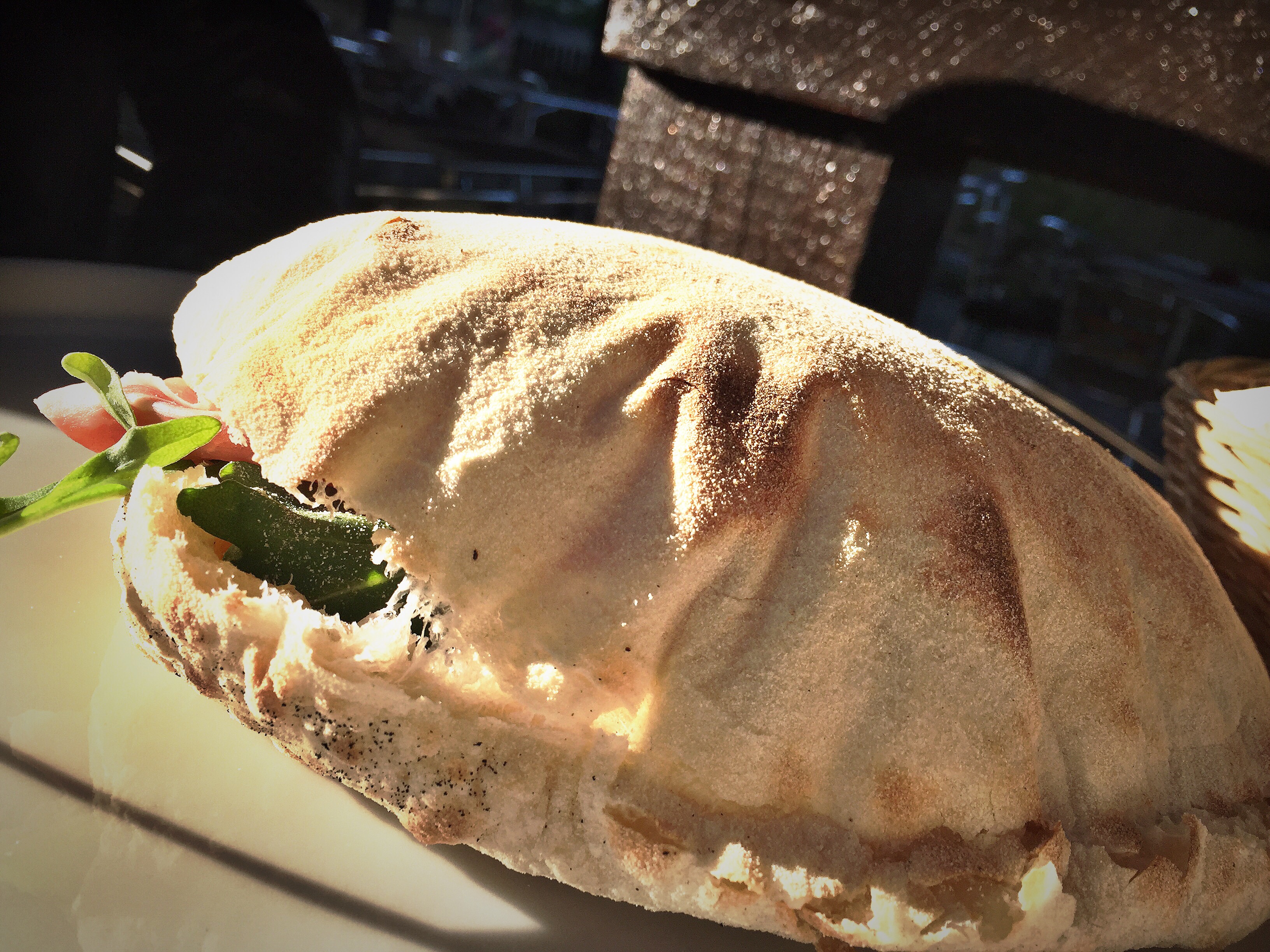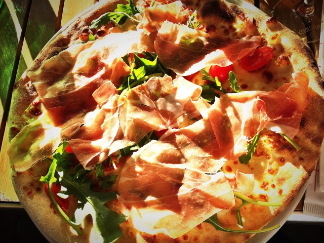 We started with drinks, I had a lemonade and hubby some beer, as starter we ordered a mixed platter of cold cuts and cheese to share, followed by a pizza Vagabondo for me – with Parma ham – while hubby had a “puccia” – a huge sandwich prepared with the pizza dough, plus some more water.