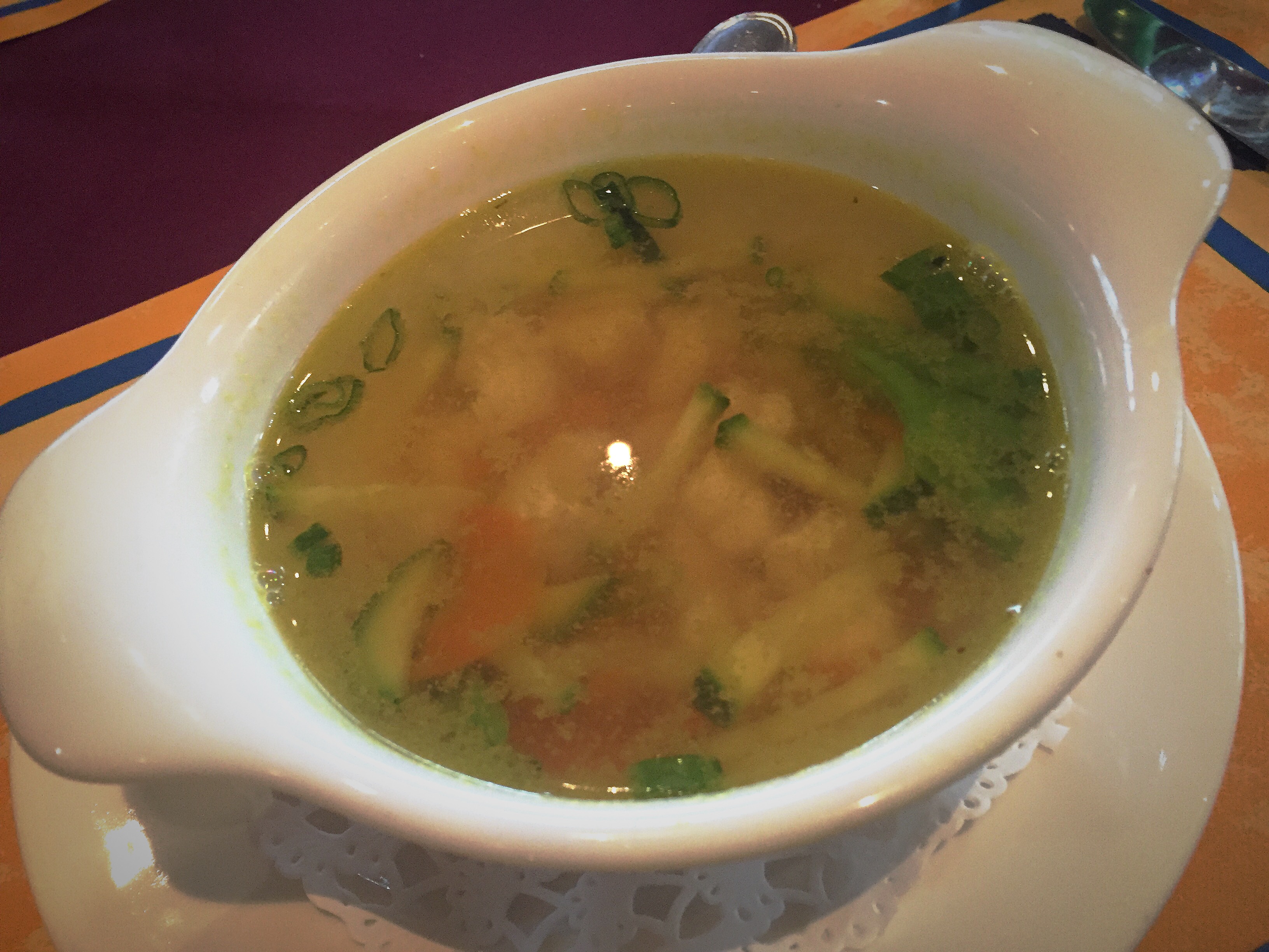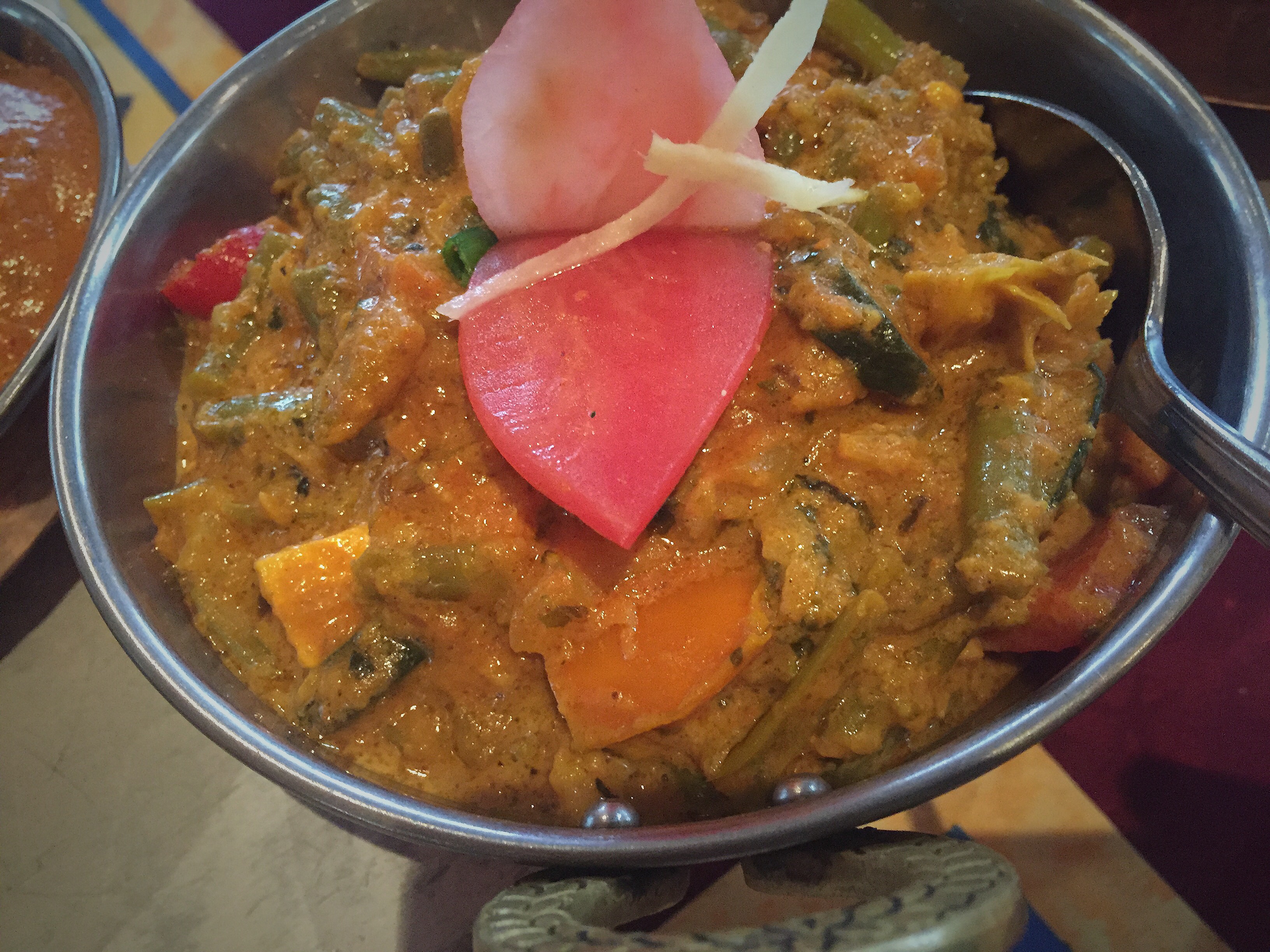 • Food was kind deluding for my Indian standards. Again, not bad in toto. but missing a sparkle. The chicken soup was a plain broth filled with boiled chicken pieces and cucumber. The Samosa hubby took were one totally without salt and the other one so salted it was impossible to eat. The Vindaloo was far from being spicy (even if I asked it to be very spicy) and the main dish portions were very small – never found an Indian restaurant where I was able to finish three shared main and still being hungry! While the pots seemed to be the usual size, both the chicken and the lamb were all full of sauce and had only 4 pieces of meat the chicken and probably 5 the lamb.