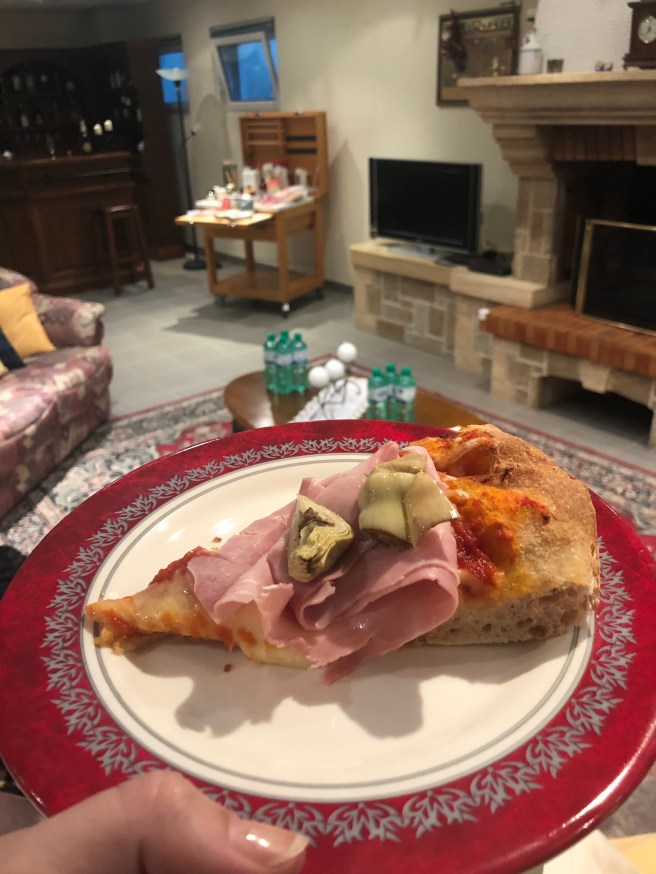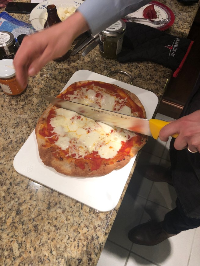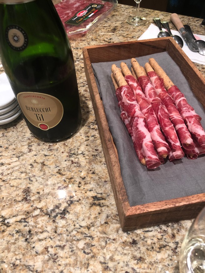 Giovanni used several products available for purchase on Tasto to prepare us a delicious dinner. As appetizers, we had linen seeds grissini rolled in Coppa, Parmigiano cheese with almonds and bell peppers cream – my favorite -, tarallini, mozzarella cheese with truffle honey. This was followed by Bresaola with oregano and olive oil and a pizza prepared with a ready to go base, ham and artichokes.
