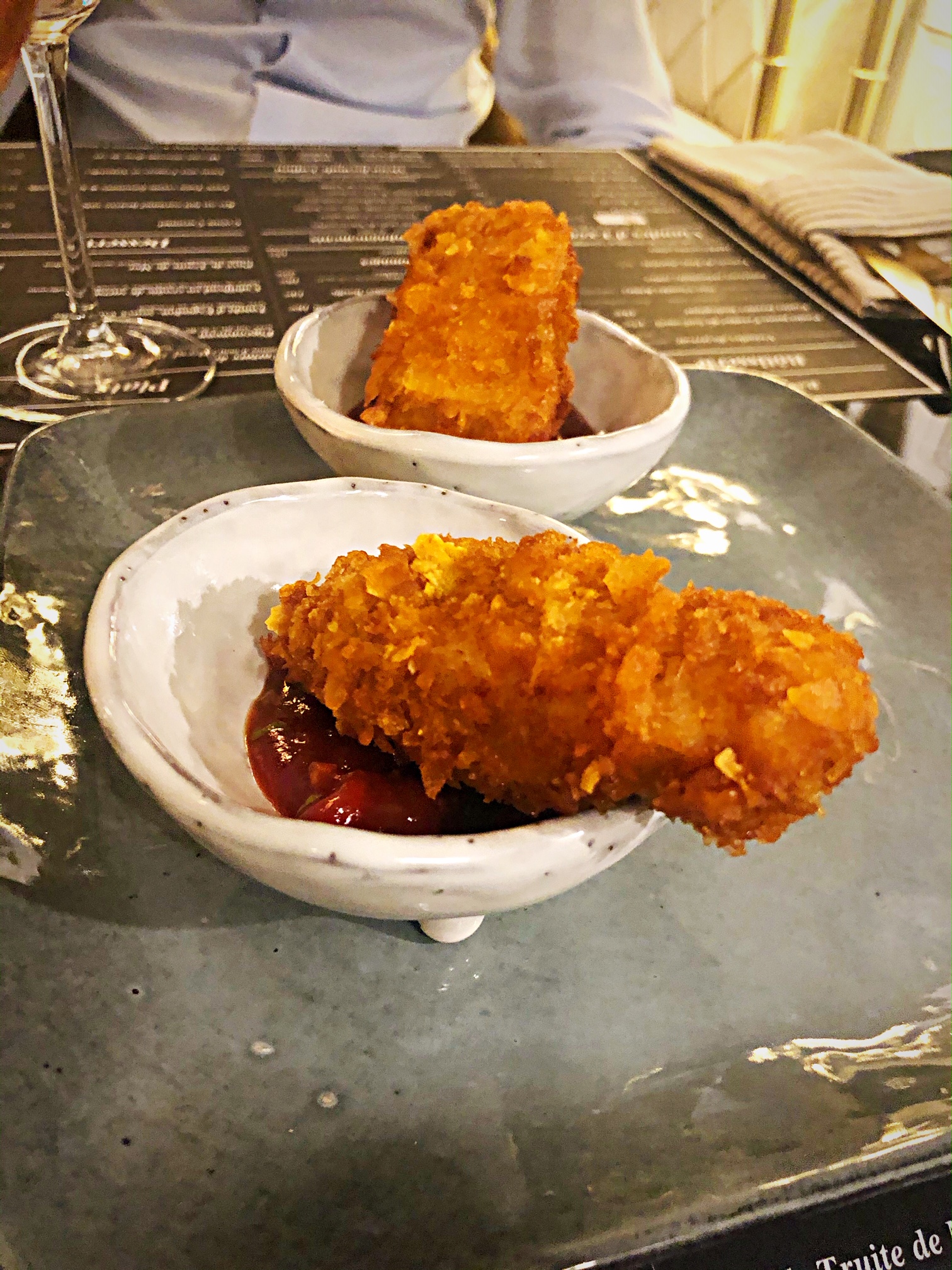 We started with a glass of champagne rose and one of wine to kick off the night, the chef welcome consisted in a chicken nuggets with ketchup sauce, both home made.