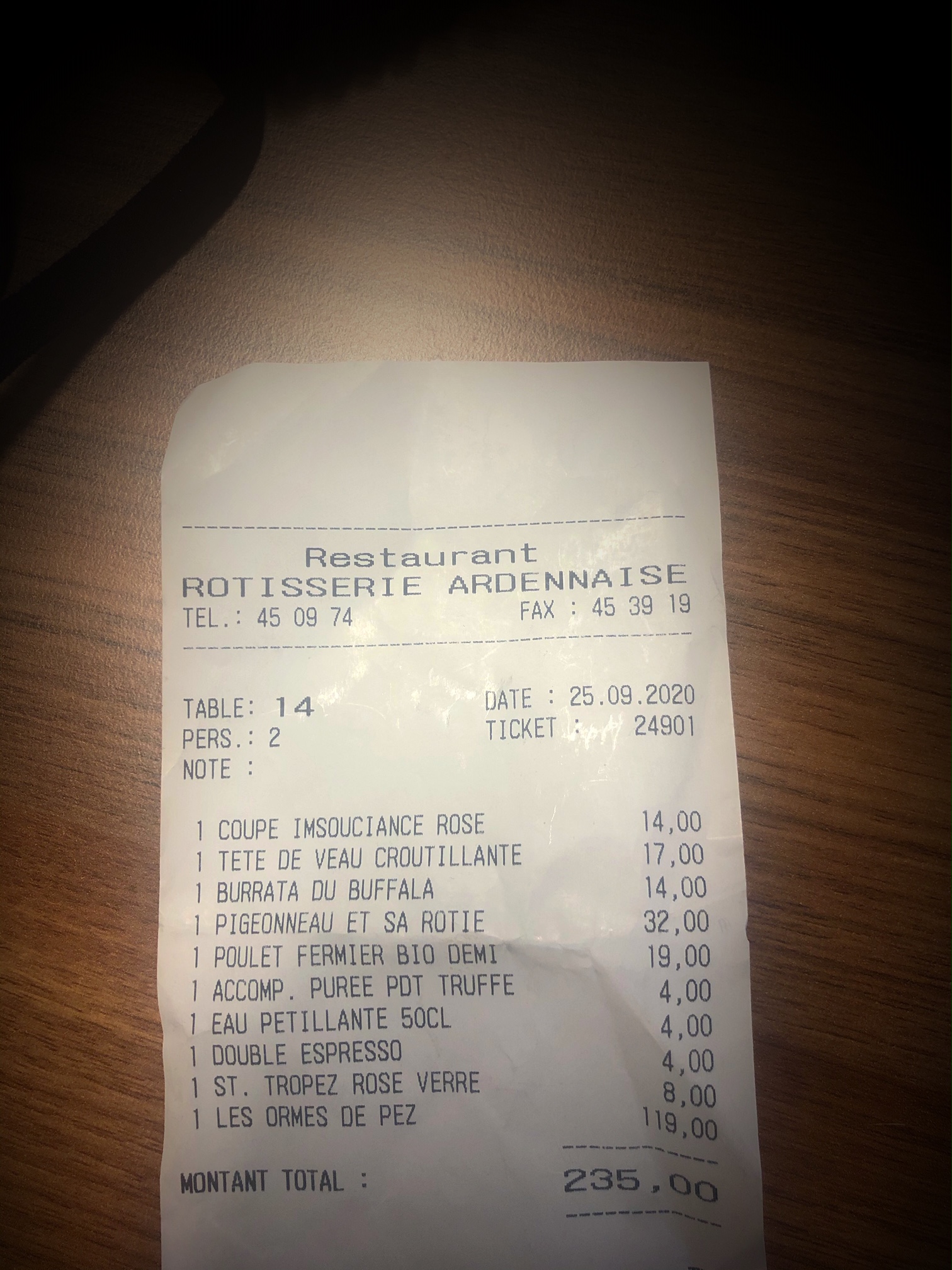 Our final bill read 235 Eur, of which 119 Eur for the one, a bottle of St. Estephe – so around 50 Euro each excluding the wine. Pictures of the dinner followed by my impressions about Rotisserie Ardennaise.