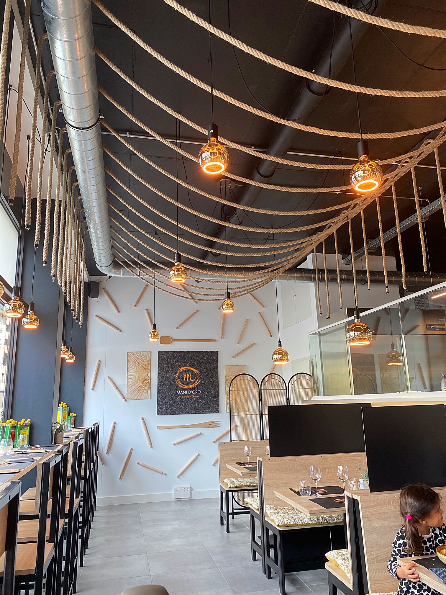 - I definitely loved the concept of the restaurant and the decorations: honestly lunch places I have tried so far are going in-between extremely cheap eatery and posh restaurants offering pricey lunch options. Mani d’Oro offers you a very affordable Italian experience in a captivating atmosphere. Also – the restaurant has a great selections of cocktails, Gin and other drinks, so it is not your usual lunchtime place.