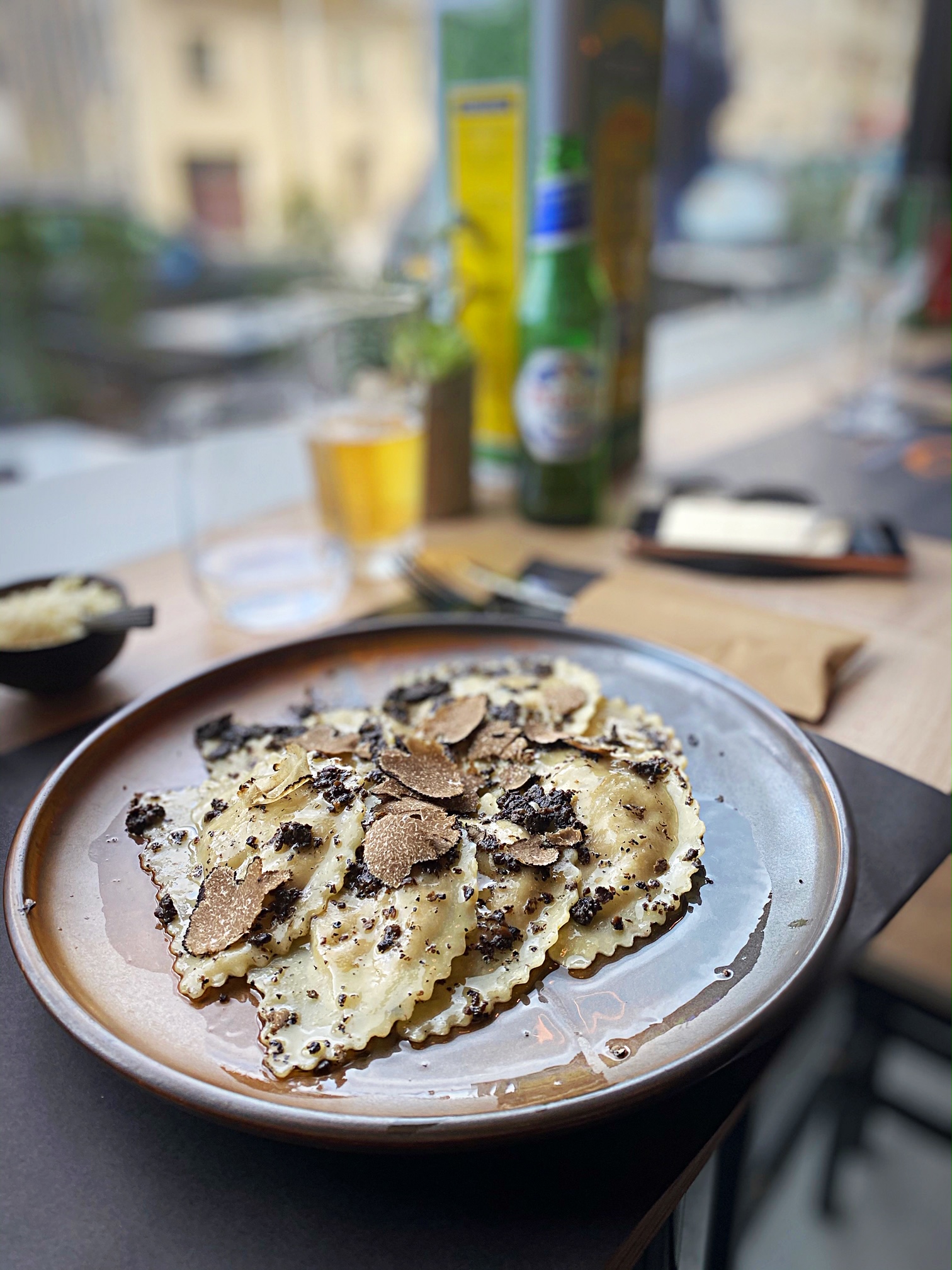 I ordered a pizza La Piccante (ventricina sausage and nduja sauce) in the smallest format while E. went for one of the daily suggestions (home made ravioli with porcini mushrooms and truffle).