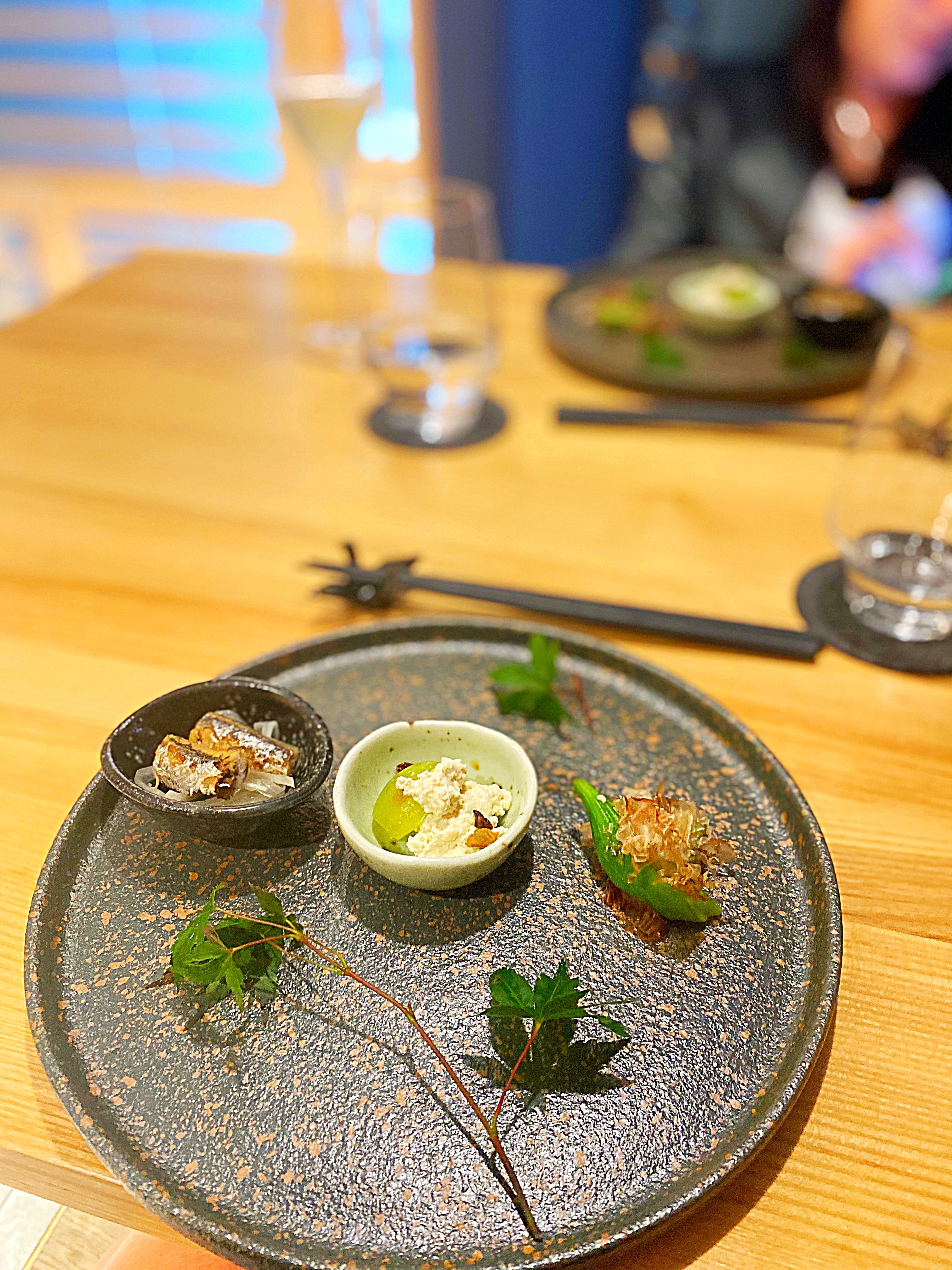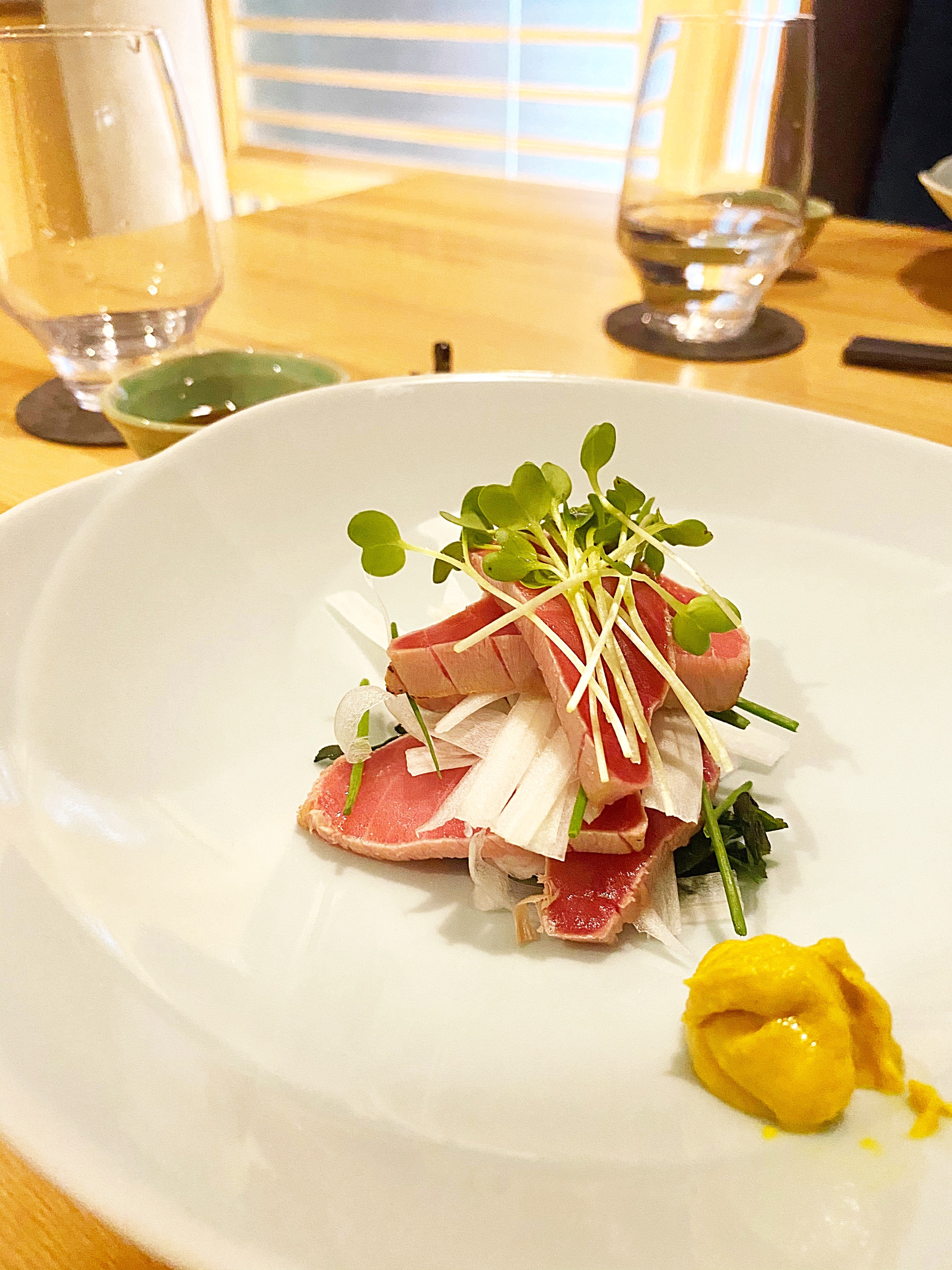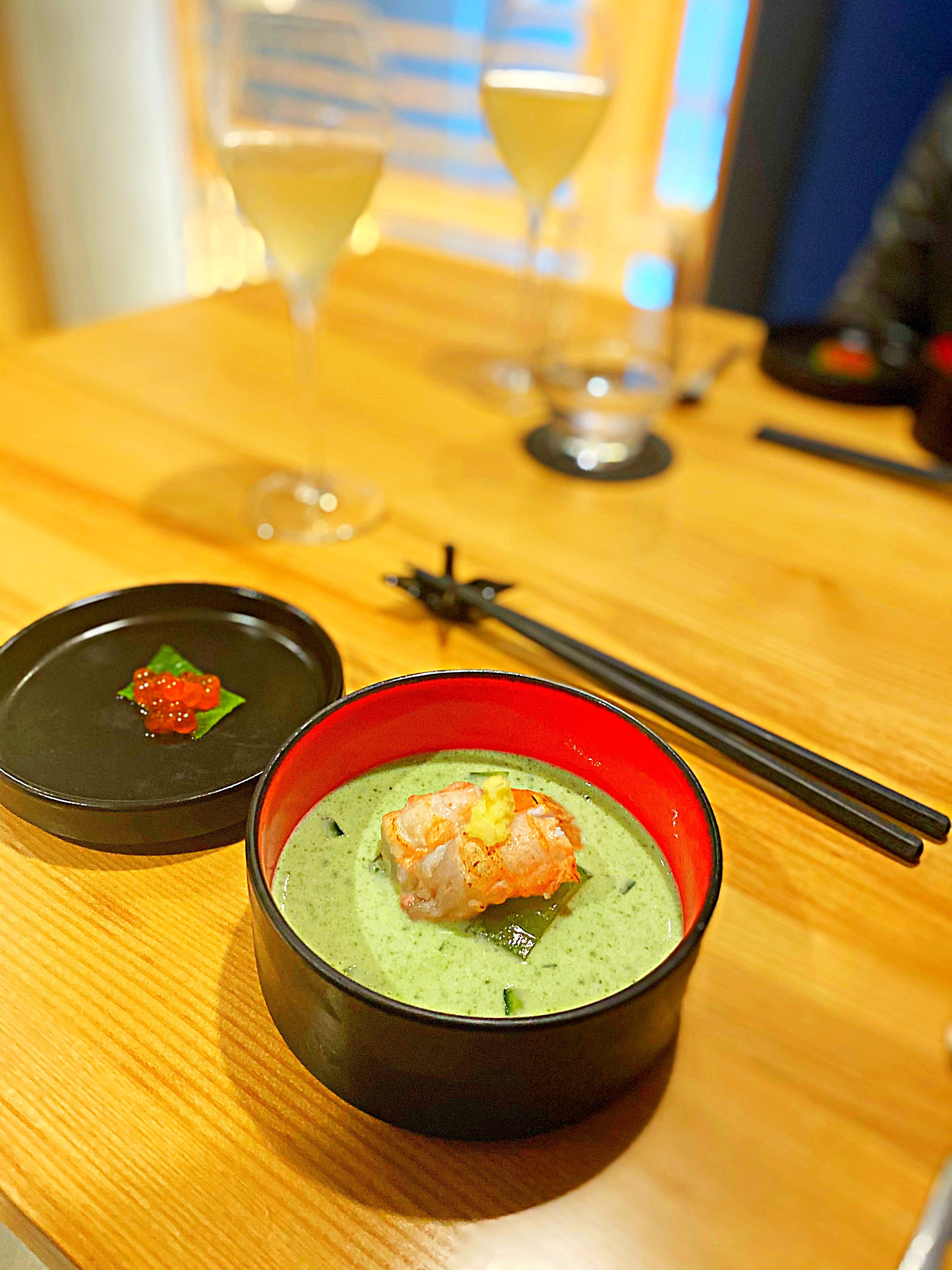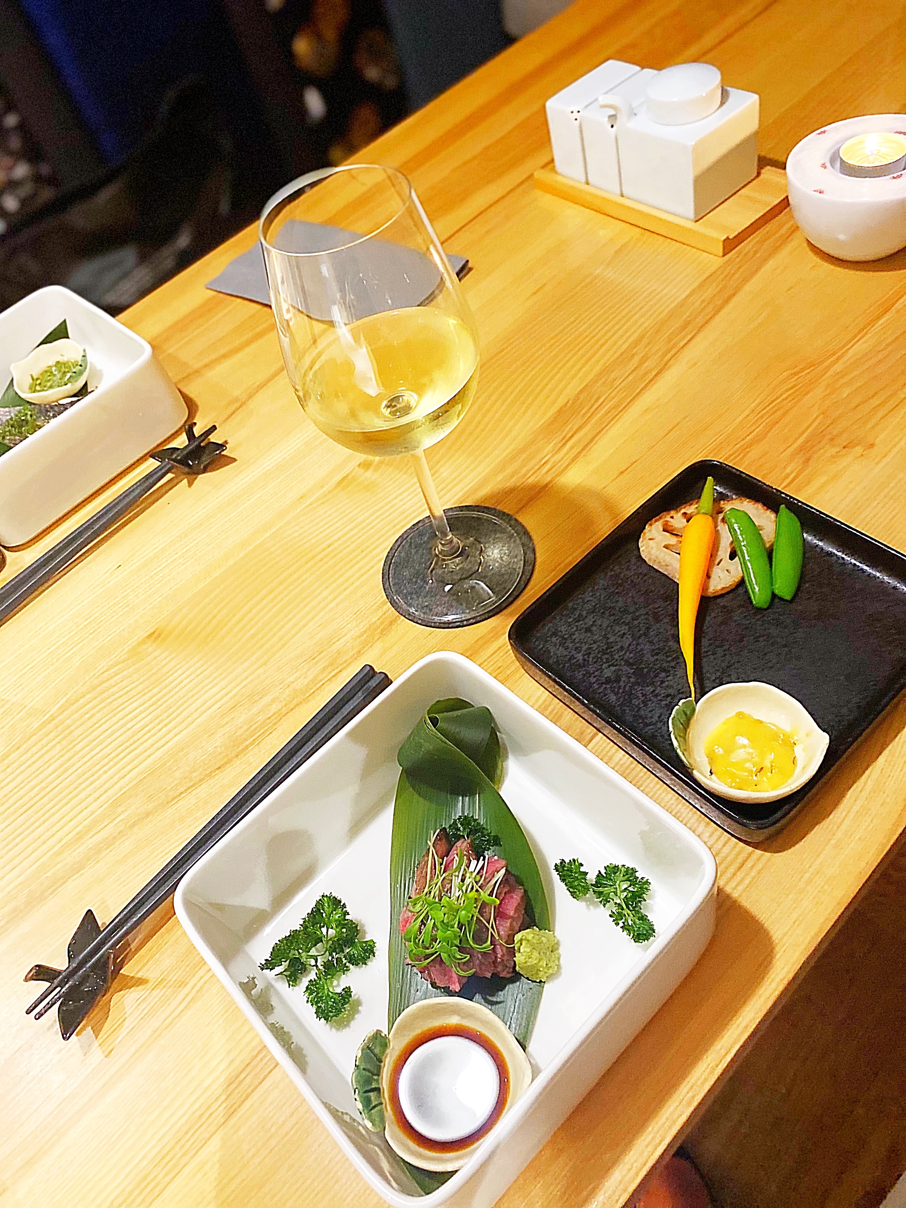 From there, it has been a crescendo. We had an aperitif maison, which was sake, crémant and yuzu. The dinner started with a sequel of minimal, but not too small, appetizers: I cannot mention one specifically as I loved them all. My friend and I were looking at each other, tasting every bite hoping the flavor was not leaving any time soon our mouth. Ingredients were amazingly fresh and the combination in every dish adventurous and surprising, with a level of interaction on our side, for example to decide if to add more or less sauce or more or less mustard to the tuna fish. I was amazed by the marinated egg yolk, combined with the avocado, probably because I could not expect a dish so simple to be so heavenly.
