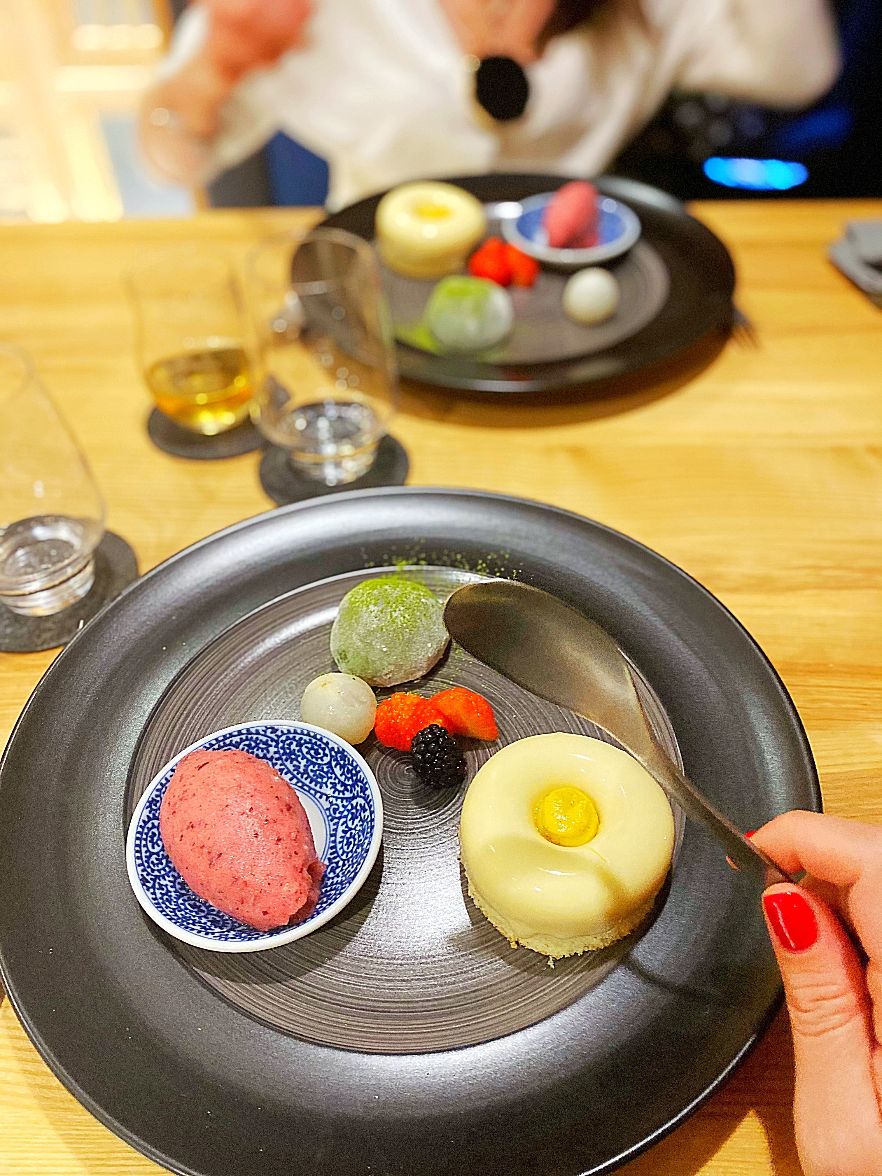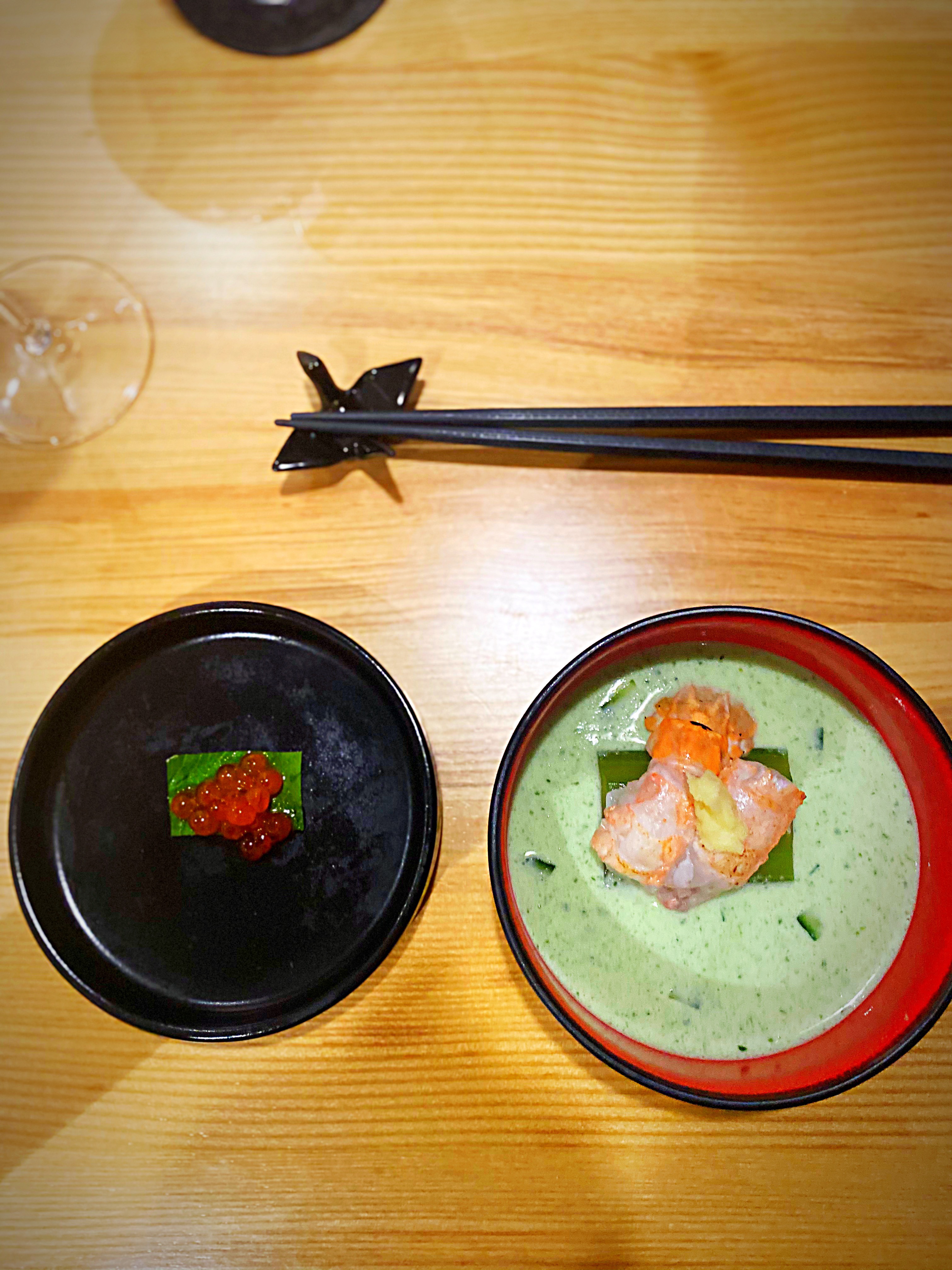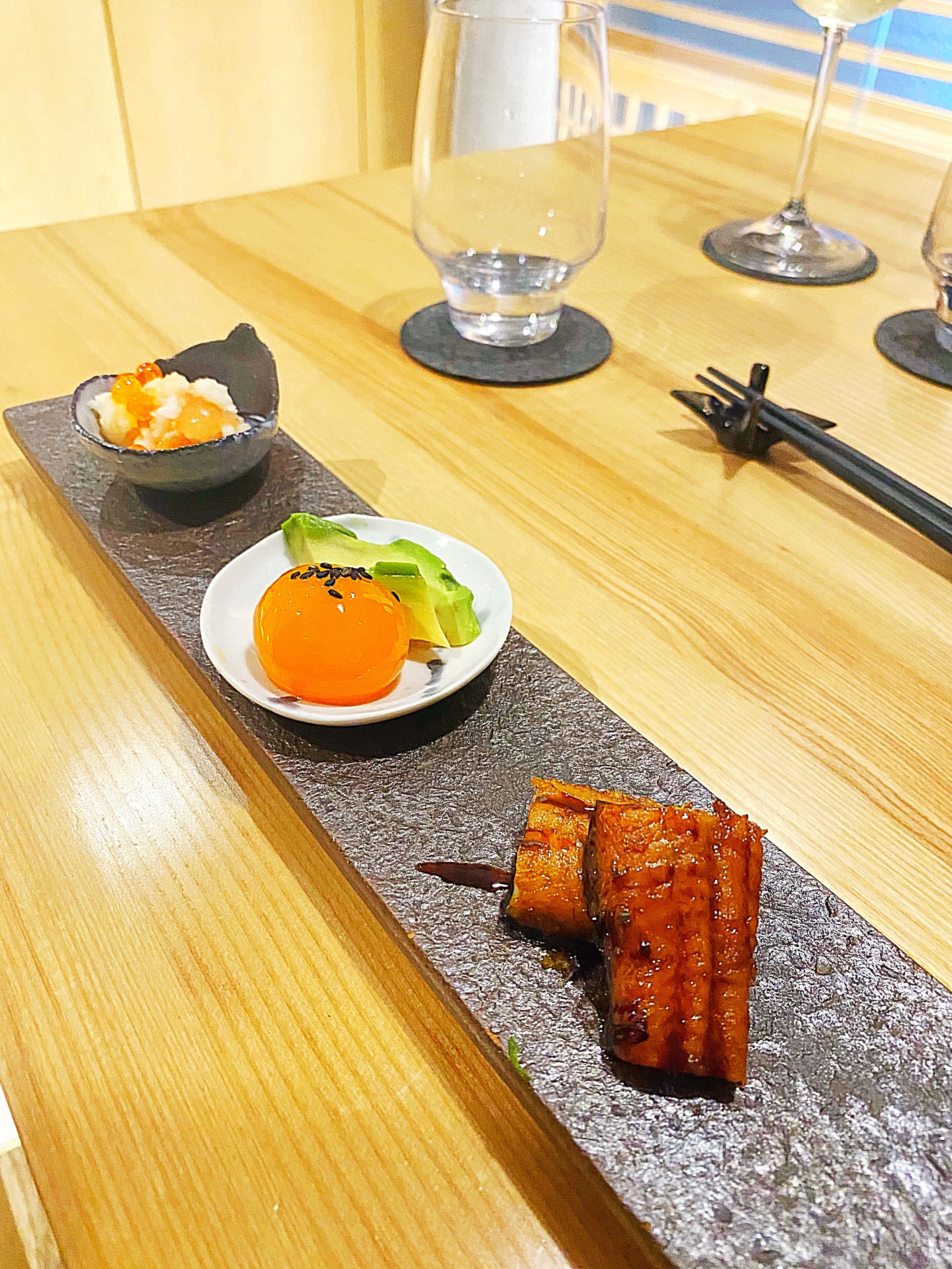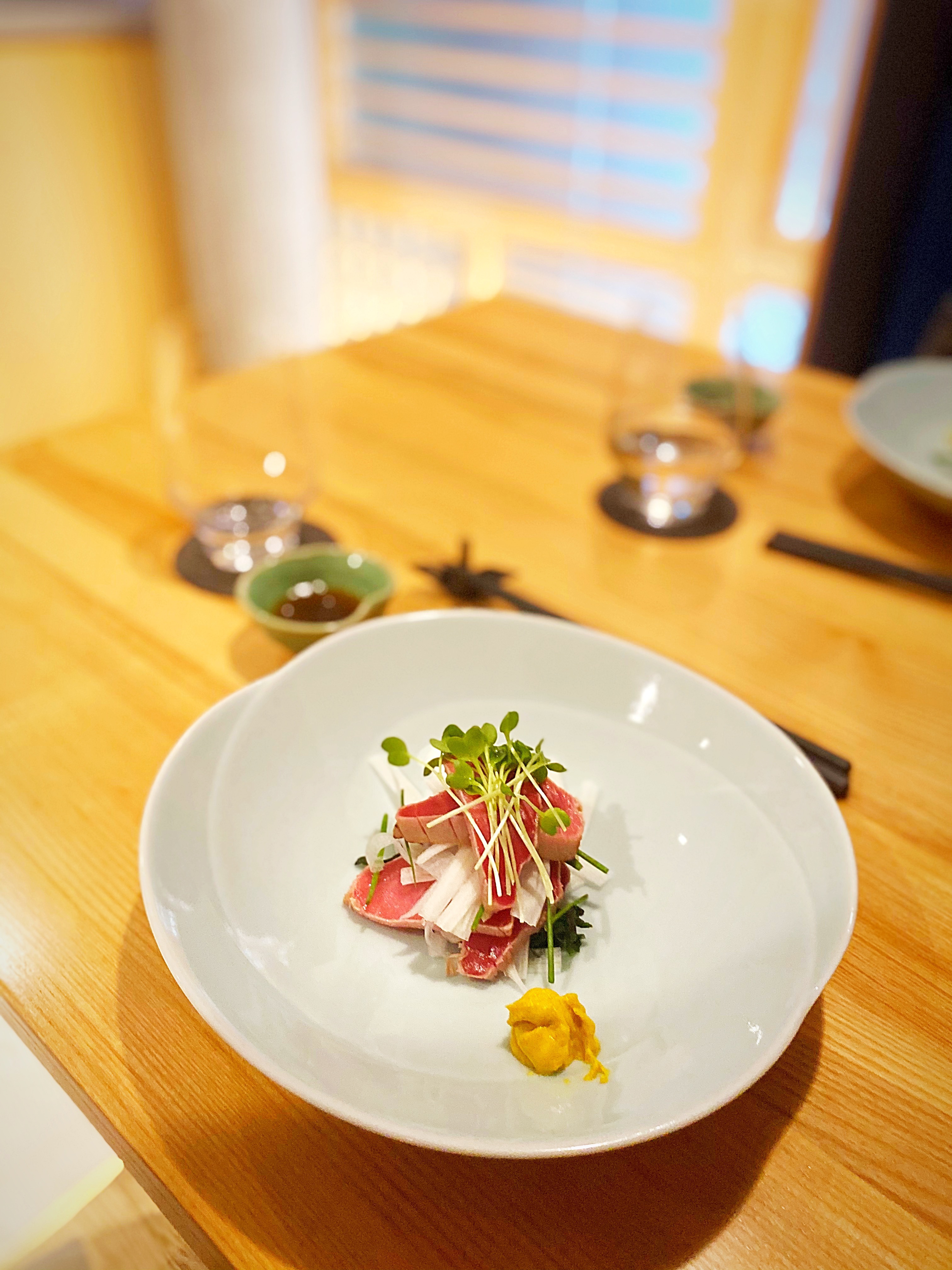 From there, it has been a crescendo. We had an aperitif maison, which was sake, crémant and yuzu. The dinner started with a sequel of minimal, but not too small, appetizers: I cannot mention one specifically as I loved them all. My friend and I were looking at each other, tasting every bite hoping the flavor was not leaving any time soon our mouth. Ingredients were amazingly fresh and the combination in every dish adventurous and surprising, with a level of interaction on our side, for example to decide if to add more or less sauce or more or less mustard to the tuna fish. I was amazed by the marinated egg yolk, combined with the avocado, probably because I could not expect a dish so simple to be so heavenly.