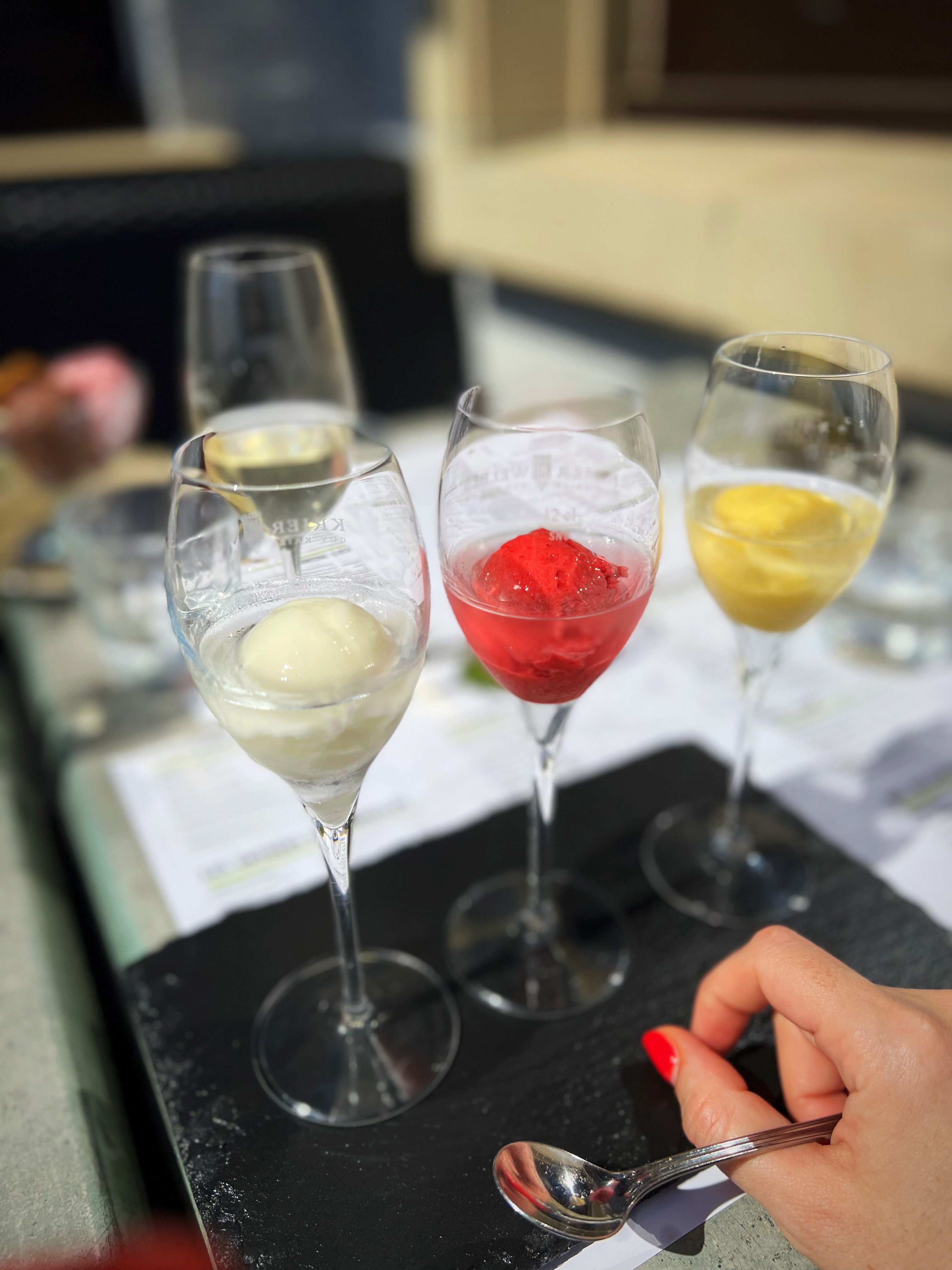 We were actually pretty full after, but as we had all the time to finish our lunch in the sun, we decided to go also for dessert. I had the trio of sorbet prepared with local “eau de vie” – which I kinda regretted while climbing up the chapel stairs 🤪 and Mr had ice cream.