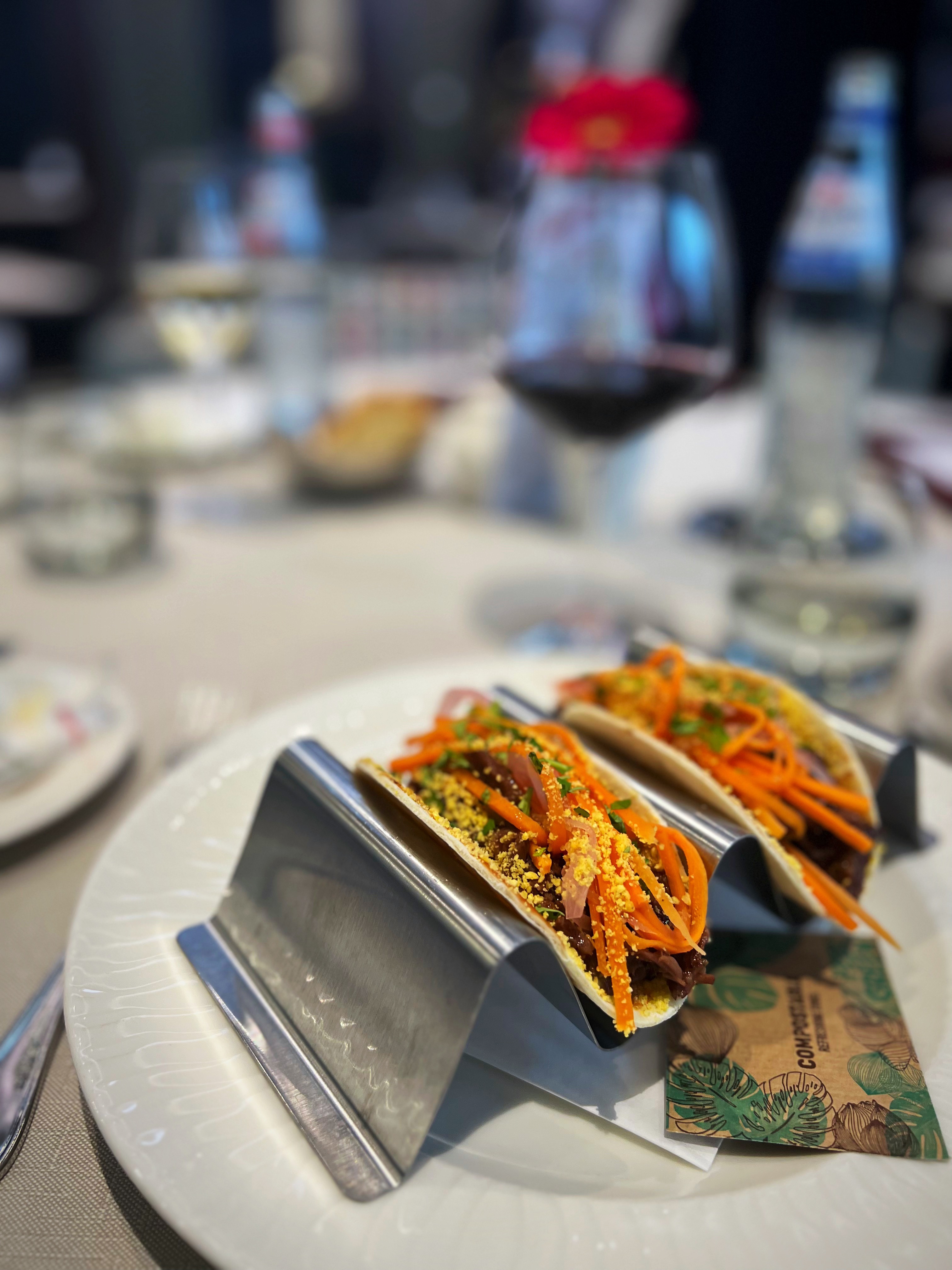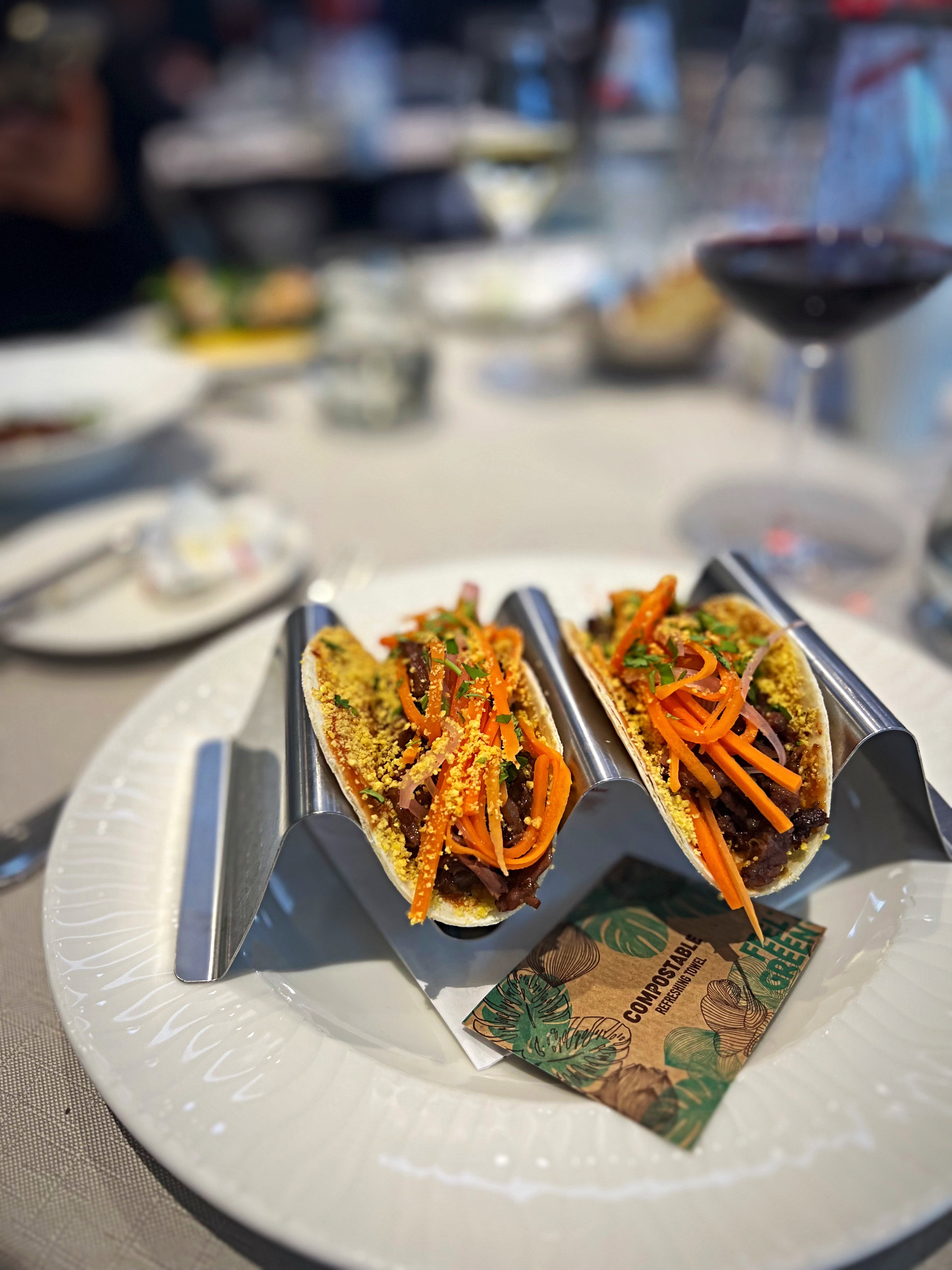 As for our lunch, I had beef tacos and egg parfait with parsnip cream and crisp quinoa. Vianee, my partner in crime, had the shrimps salad next to the egg.