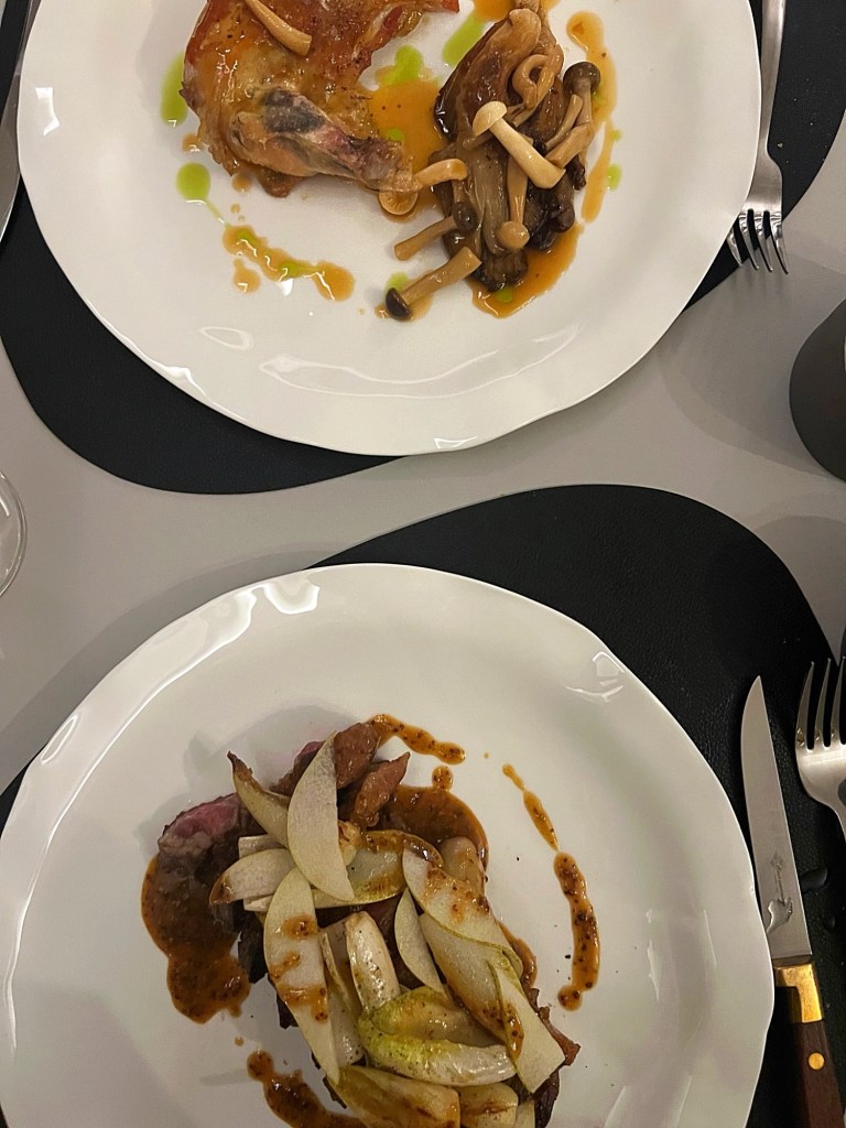 I ordered the Jerusalem Artichoke with egg confit, followed by beef fillet served with pears and endive. Mr had the champignon toast, one of the several vegetarian dishes available, followed by guinea fowl and oyster mushrooms.