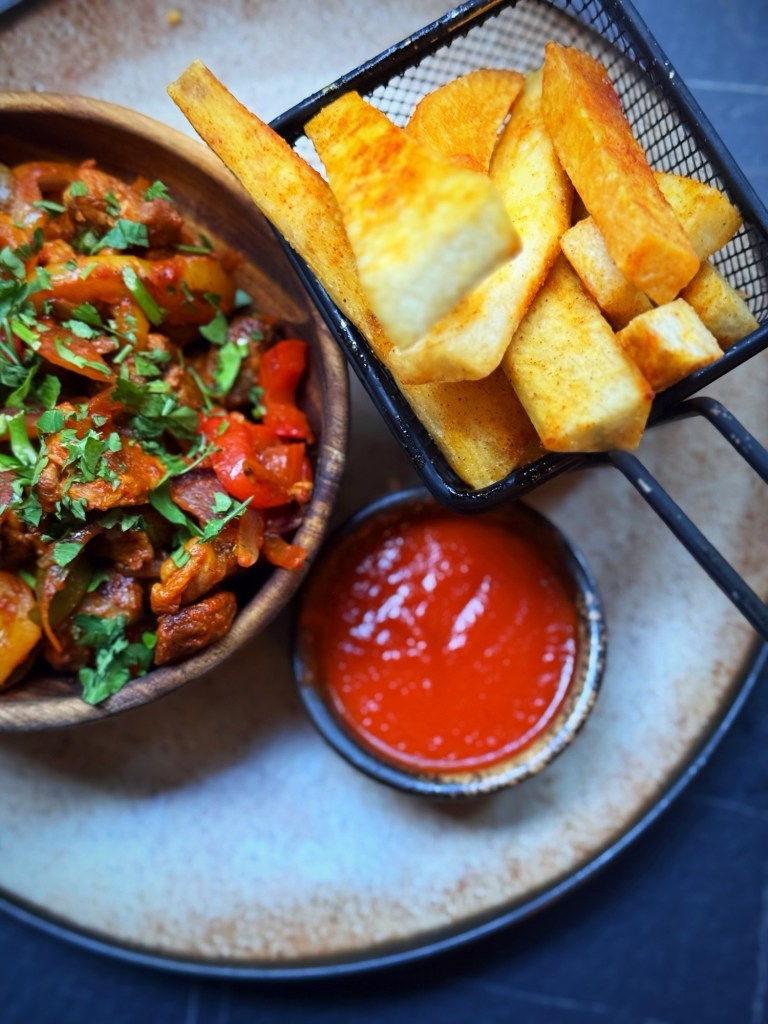 This time around, I started with something light but incredibly flavorful: the bean hummus with ewa agoyin sauce and bread croutons. The texture? Silky-soft. The flavour? Deep, warming, layered — far beyond your average starter. A perfect mix of tradition and creativity.