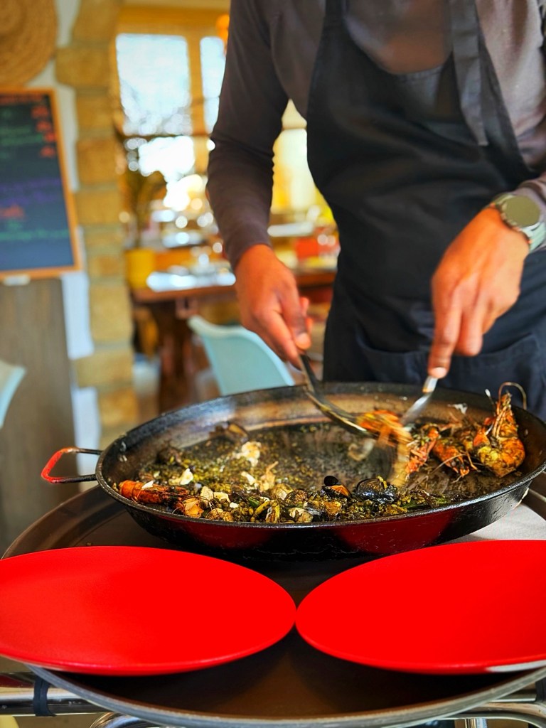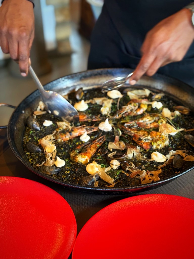 Then came the squid-ink paella. Black, glossy, rich, briny — a dish that makes conversation stop and forks move faster. Perfectly cooked rice, deep flavour, a little drama on the plate.
