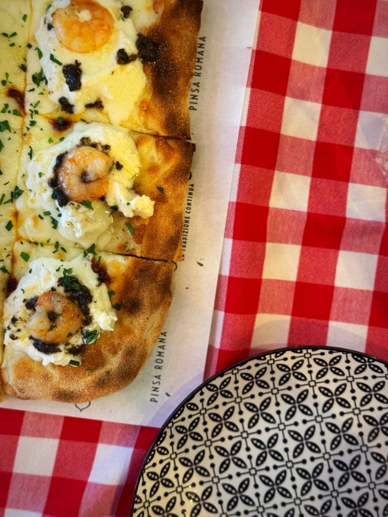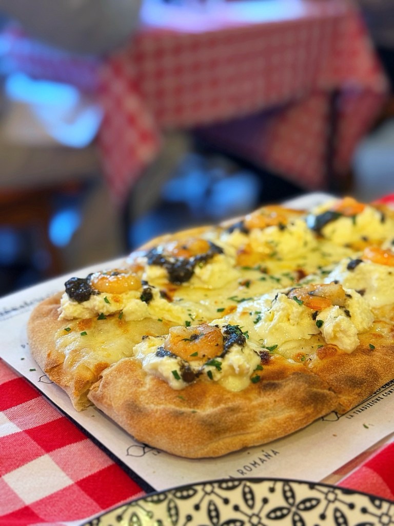 We started with a pinsa topped with burrata, shrimps, and truffle. Now, full disclosure: as an Italian, I am typically very sceptical about seafood on anything resembling pizza. It is one of those deeply ingrained culinary biases.
